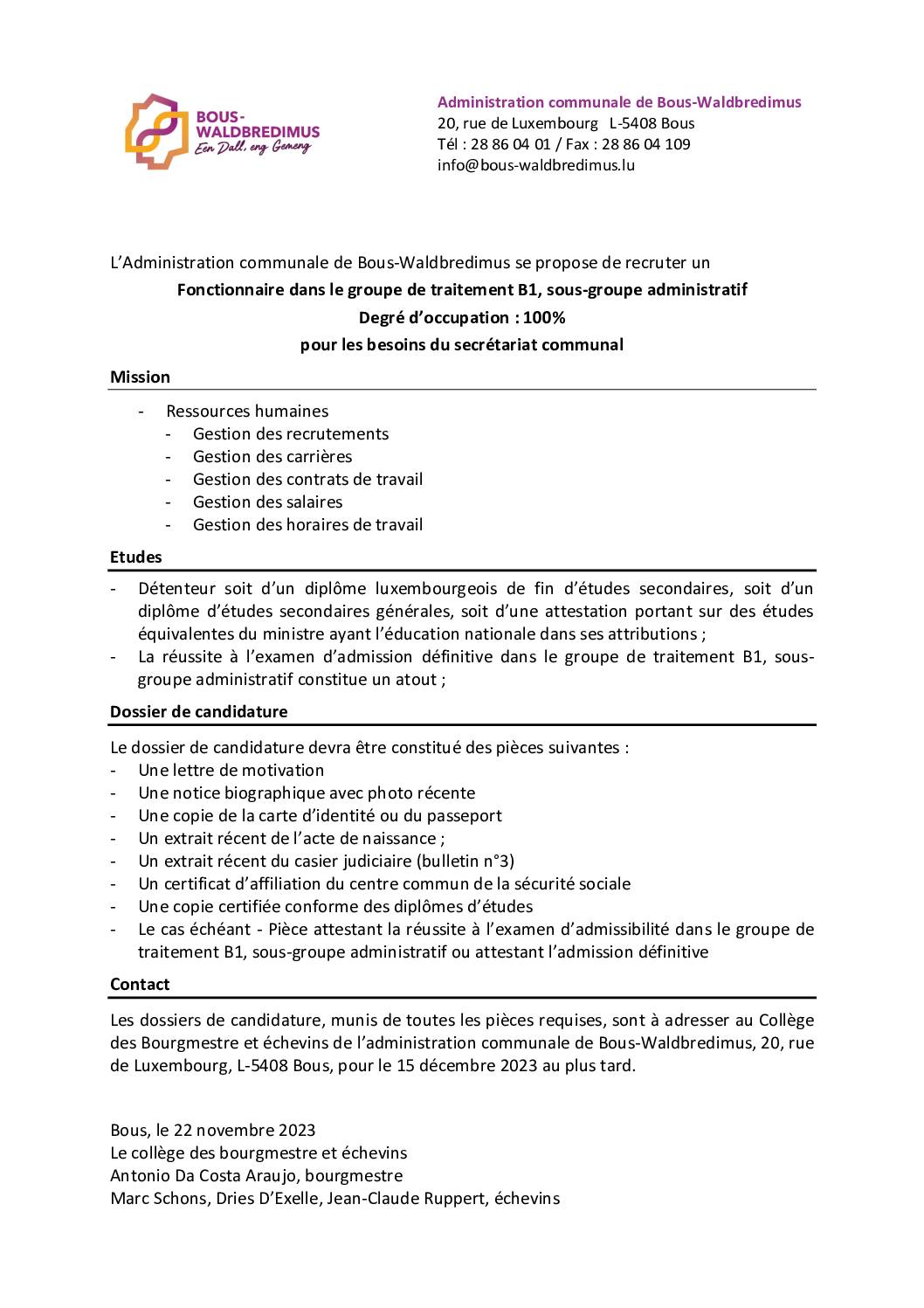 Recrutement d’un fonctionnaire, sous-groupe administratif